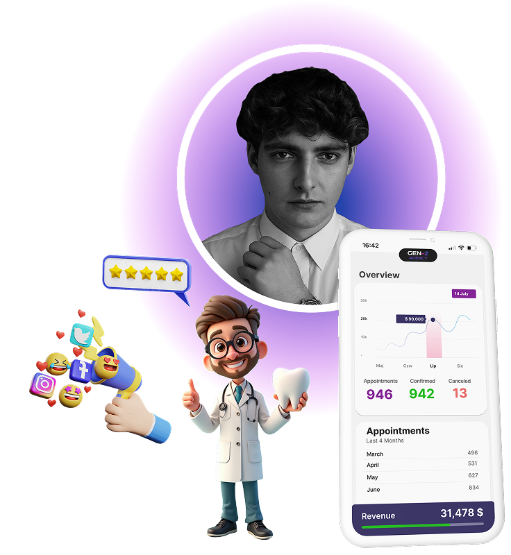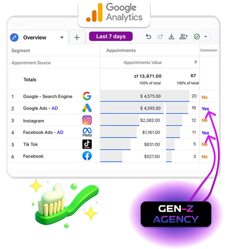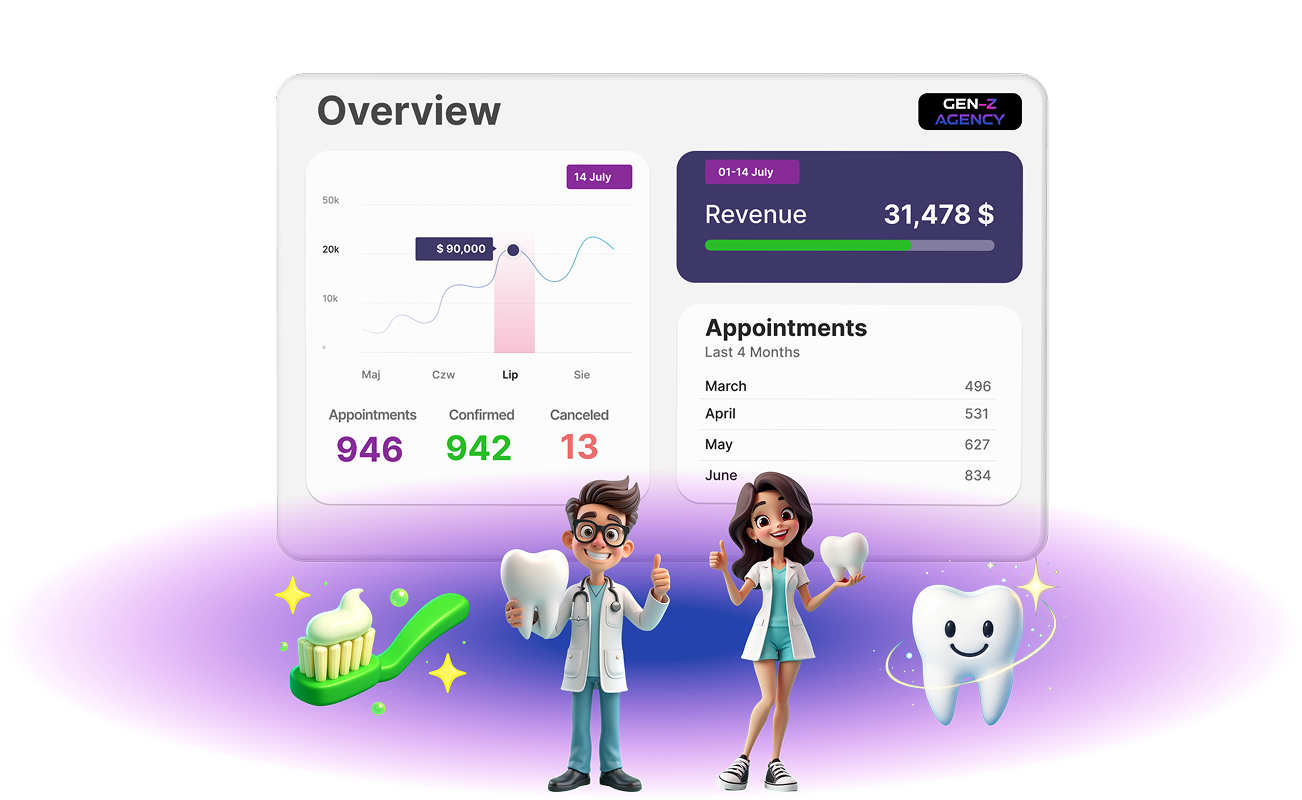 At Gen-Z Agency, our mission is to drive real growth for your practice. We're a results-driven marketing agency specializing in dental clinic marketing, helping you acquire new patients and fill your schedule. See how our pay-per-result model delivers actual appointments, so you only pay when we generate a tangible outcome. You get marketing with results, not empty promises.