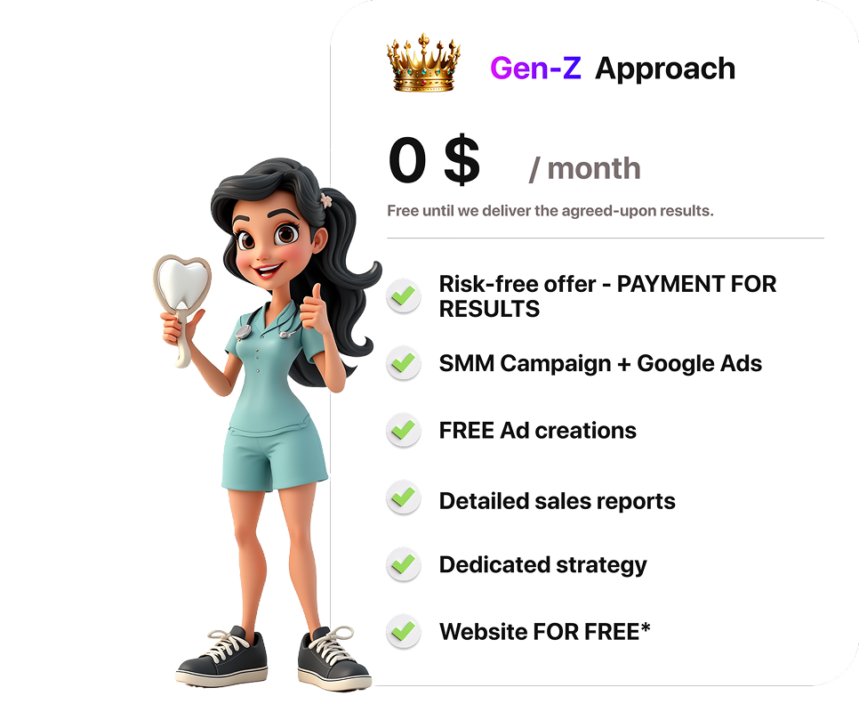 Gen-Z Agency operates on a pay-per-result model, so you only pay us when we deliver a tangible outcome for your dental practice, like a new patient. This approach ensures your investment is tied directly to your business's growth and minimizes your risk. We’re fully motivated to get your dental clinic more bookings and help you see real results from your dental marketing.